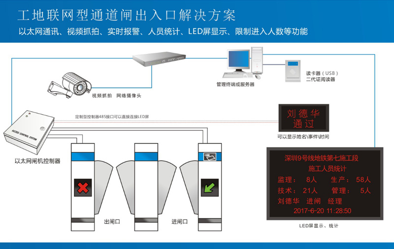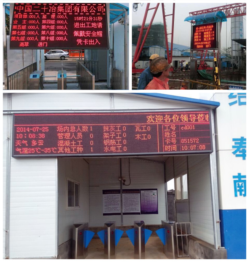 目前国家政府越来越注重工程项目的安全防范问题,为了更安全、智能化的管理工地项目,我司研发了LED工地考勤劳务管理系统。内部施工人员刷卡通道闸机进入工地项目,解决通行安全问题,非工作人员严禁进入实施重地;工作人员刷卡同时还可以采集工作考勤记录,形成薪资报表,方便劳务管理;项目负责领导还可以根据外接LED屏幕显示的数据,了解到施工项目当前工作人员情况,项目现场温度,天气等环境情况。